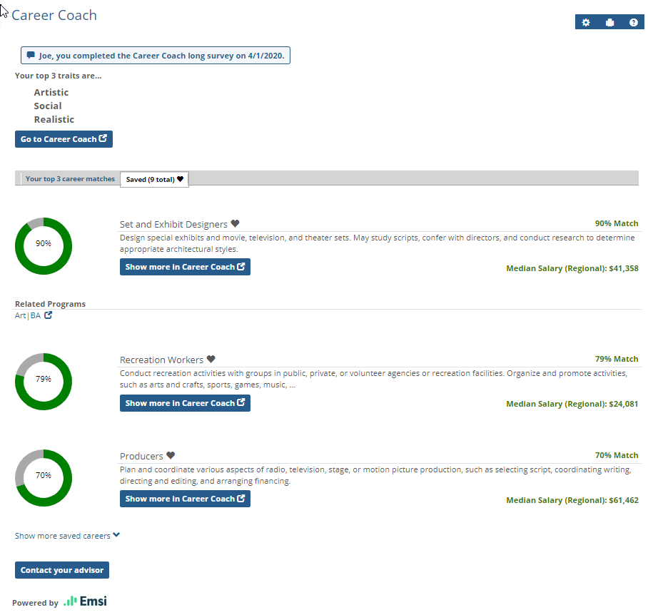 Career Coach is a powerful tool to help you find potential careers that you might do well in, based on your interests. If your school has integrated Emsi Career Coach with the campus portal, you can view your career assessment results in this feature. All of the information shown in the Career Coach feature comes directly from the Career Coach website.