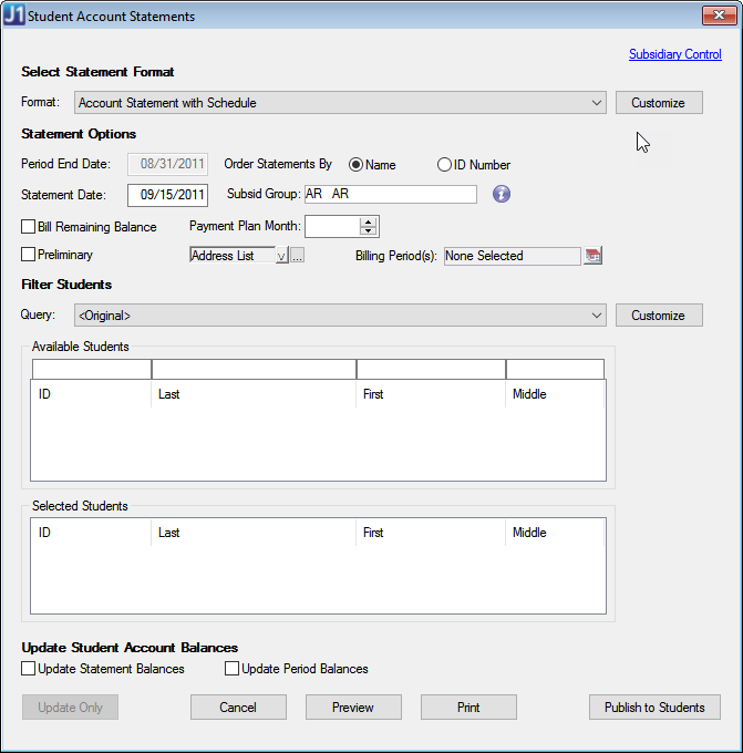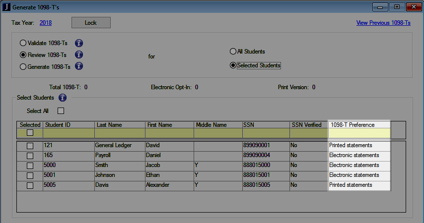 No setup is required in J1 Desktop to support the Financial Document Center feature; however, in order for students to view their documents in the Financial Document Center, any 1098-Ts and statements must be generated in J1 Desktop. |