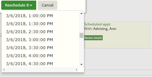 The My Advisor Meetings feature allows you to choose from designated timeslots to set up a meeting with your advisor. You can also view past meeting dates, see upcoming meeting details, or reschedule a meeting for another available time. See video overview.
