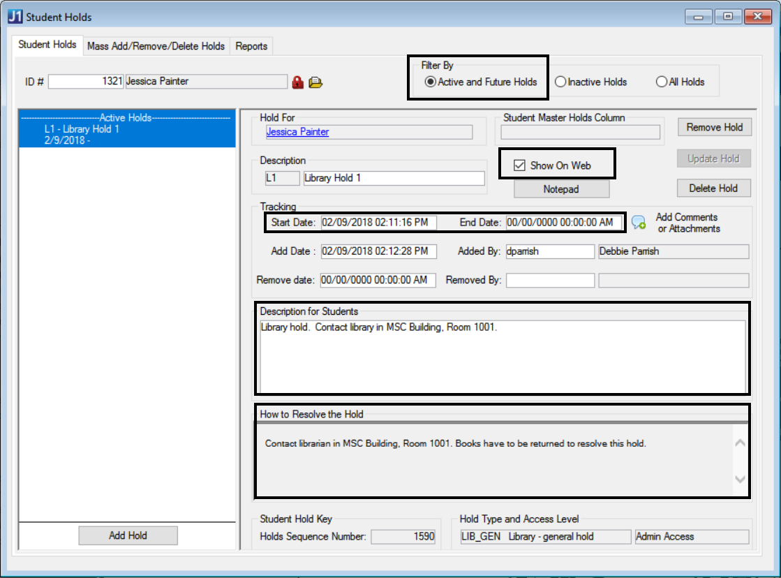 If a hold appears on the student’s account, they will be able to see why the hold appeared and how to resolve the issue. It is important for the Description for Students and How to Resolve the Hold fields are entered clearly. Example