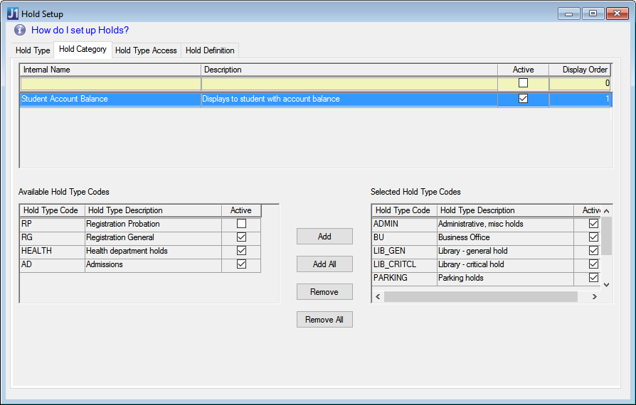 If you want holds to appear in the My Financial Account portlet in the JICS Campus Portal for students, you will need to identify holds and assign the Hold Category of Student Account Balance. Example