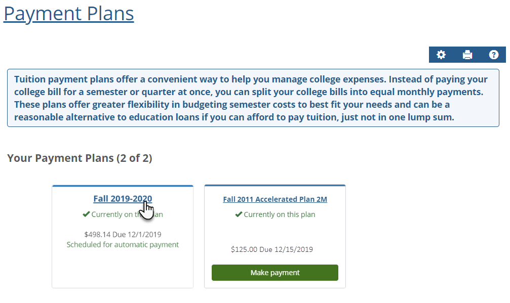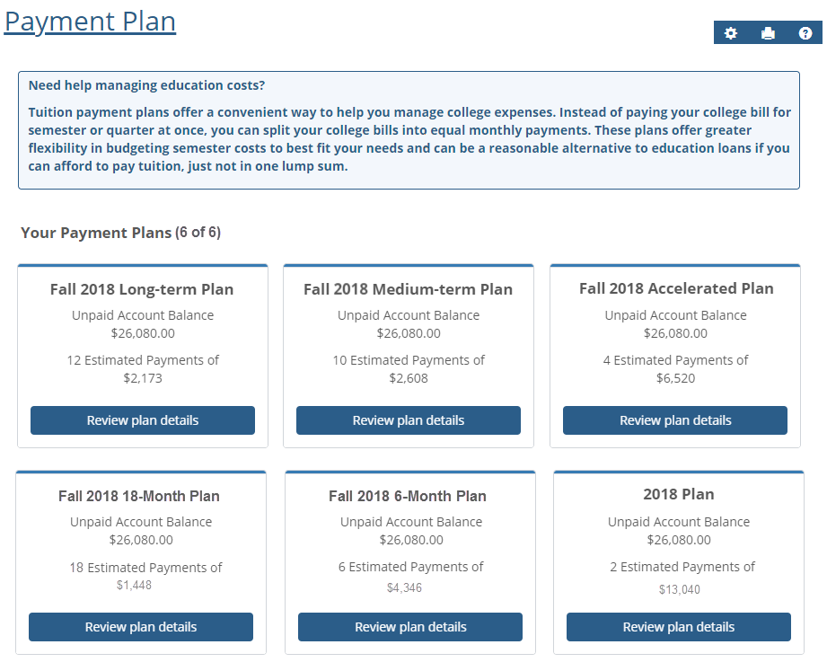 The Payment Plan feature offers a convenient way to help you manage college expenses. Instead of paying your college bill for a semester or quarter at once, you can split your college bills into monthly payments. From this page, you can view your eligible payment plans and choose the option that is right for you. Example