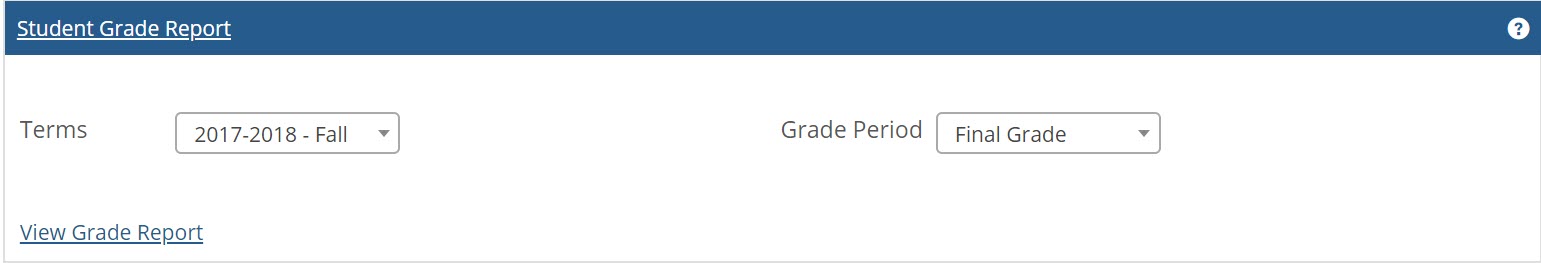 The Student Grade Report feature allows you to check grades by specific durations within the school term. Final grade period and Midterm grade period are the default grade report views. You may also view any custom defined grade periods, and you can open a printer-friendly PDF version of the report, as well.