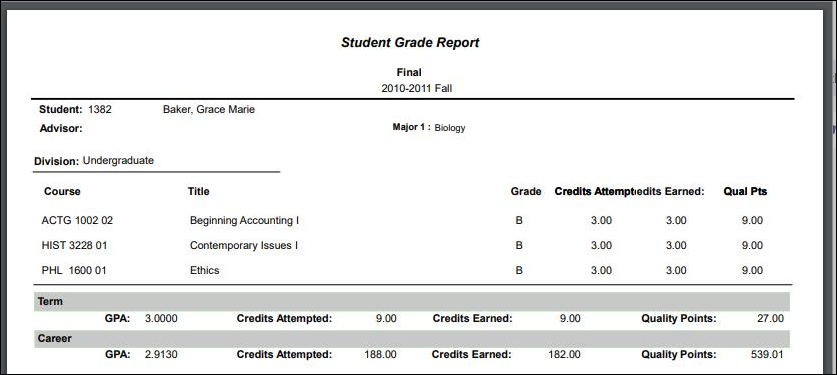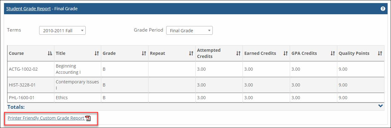 The Final grade period displays course, title, grade, whether the course is a repeat, attempted credits, earned credits, GPA credits, and quality points. Under the grade report, you can expand the Totals section to display your term and career total credits, quality points, and GPA.