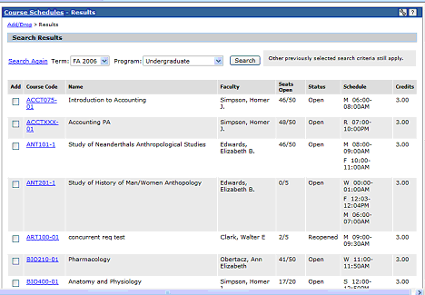 The Course Search Results screen displays the information returned by conducting a Course Search.